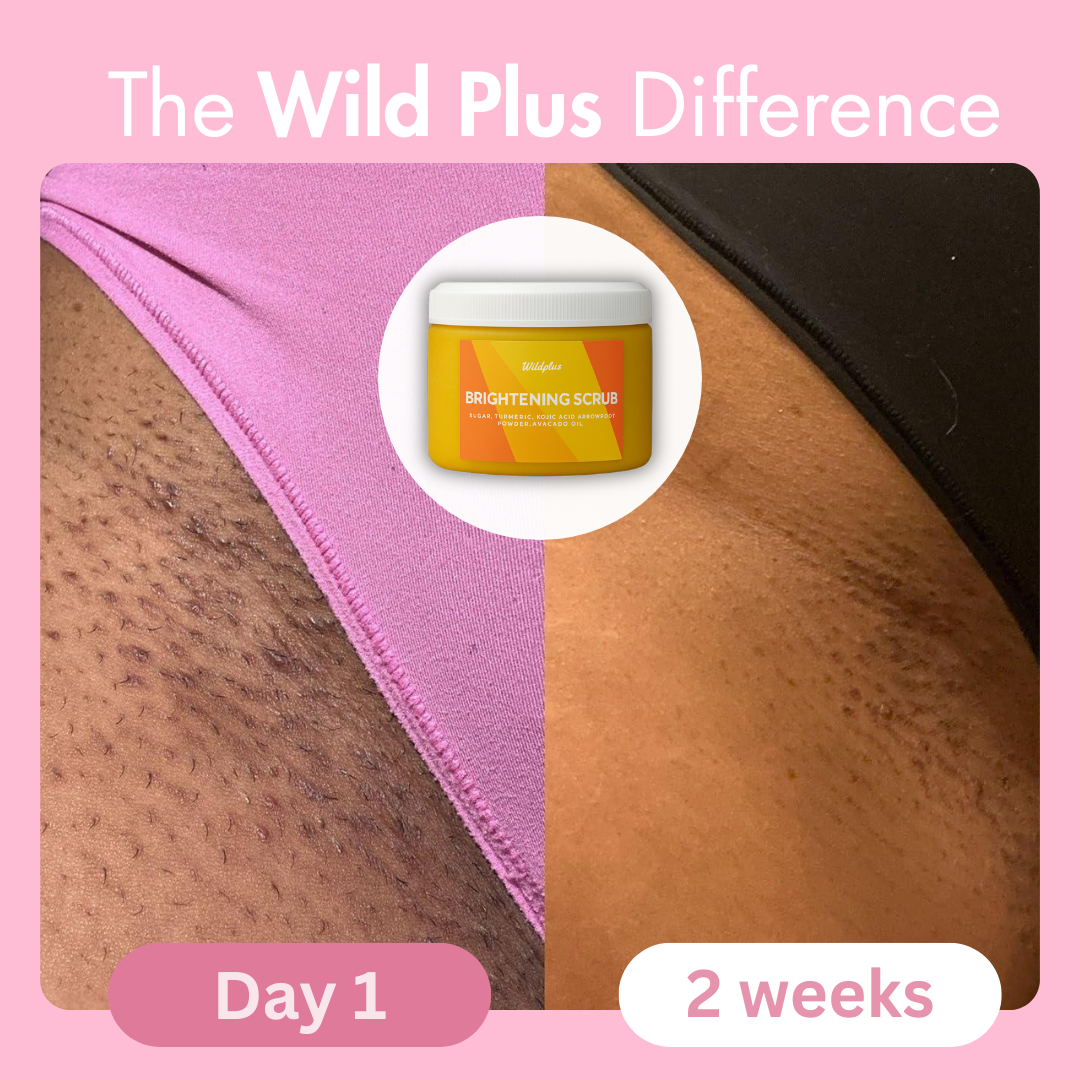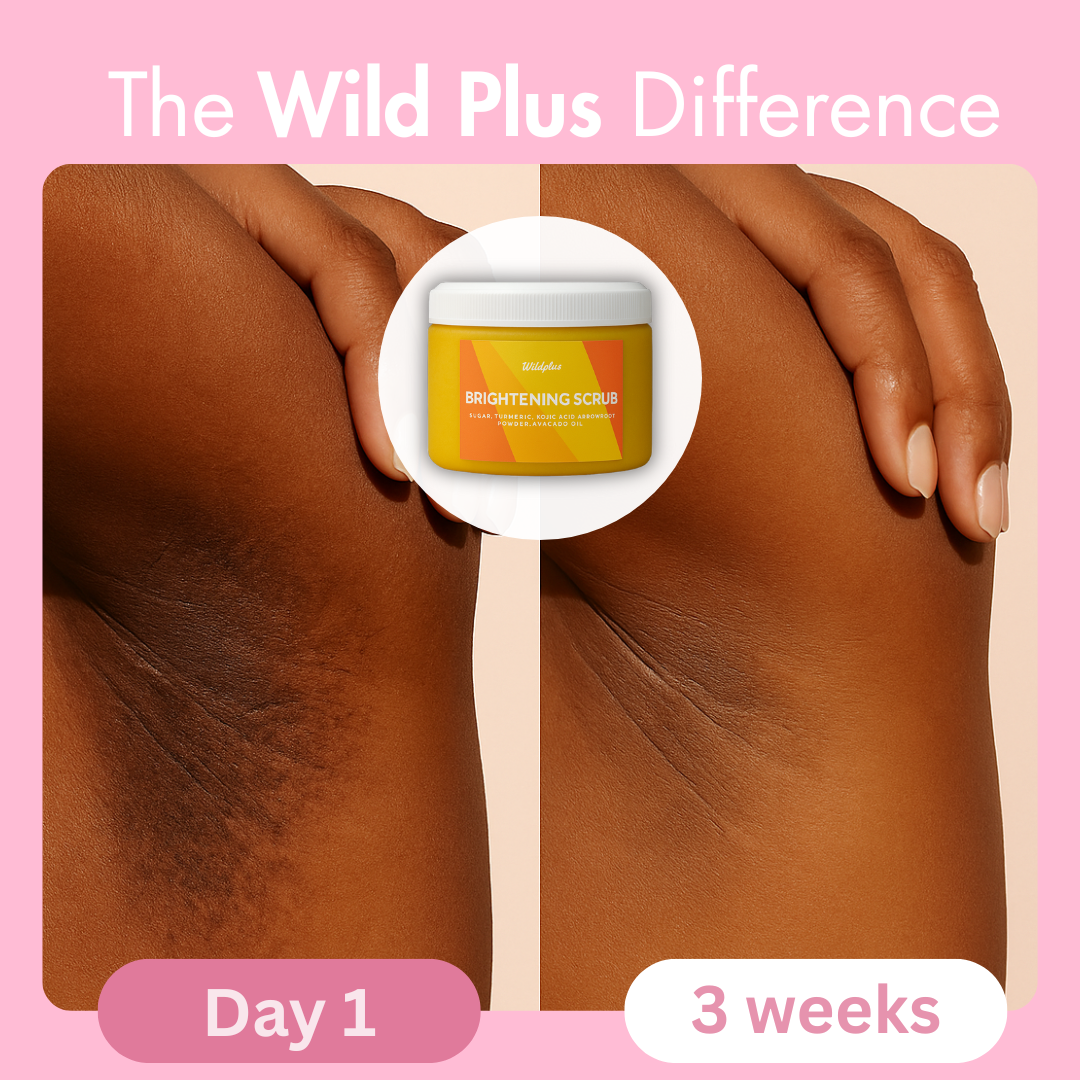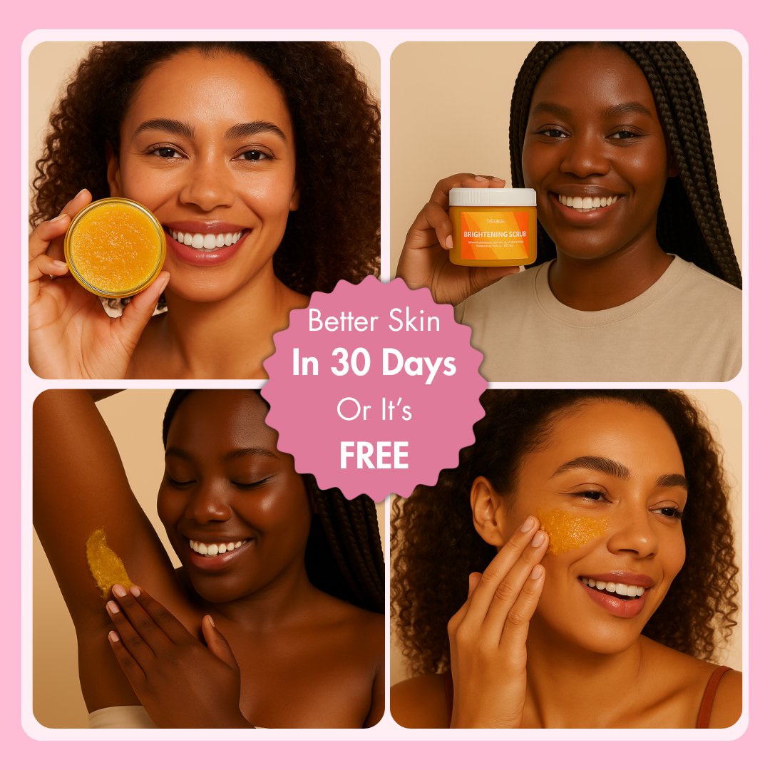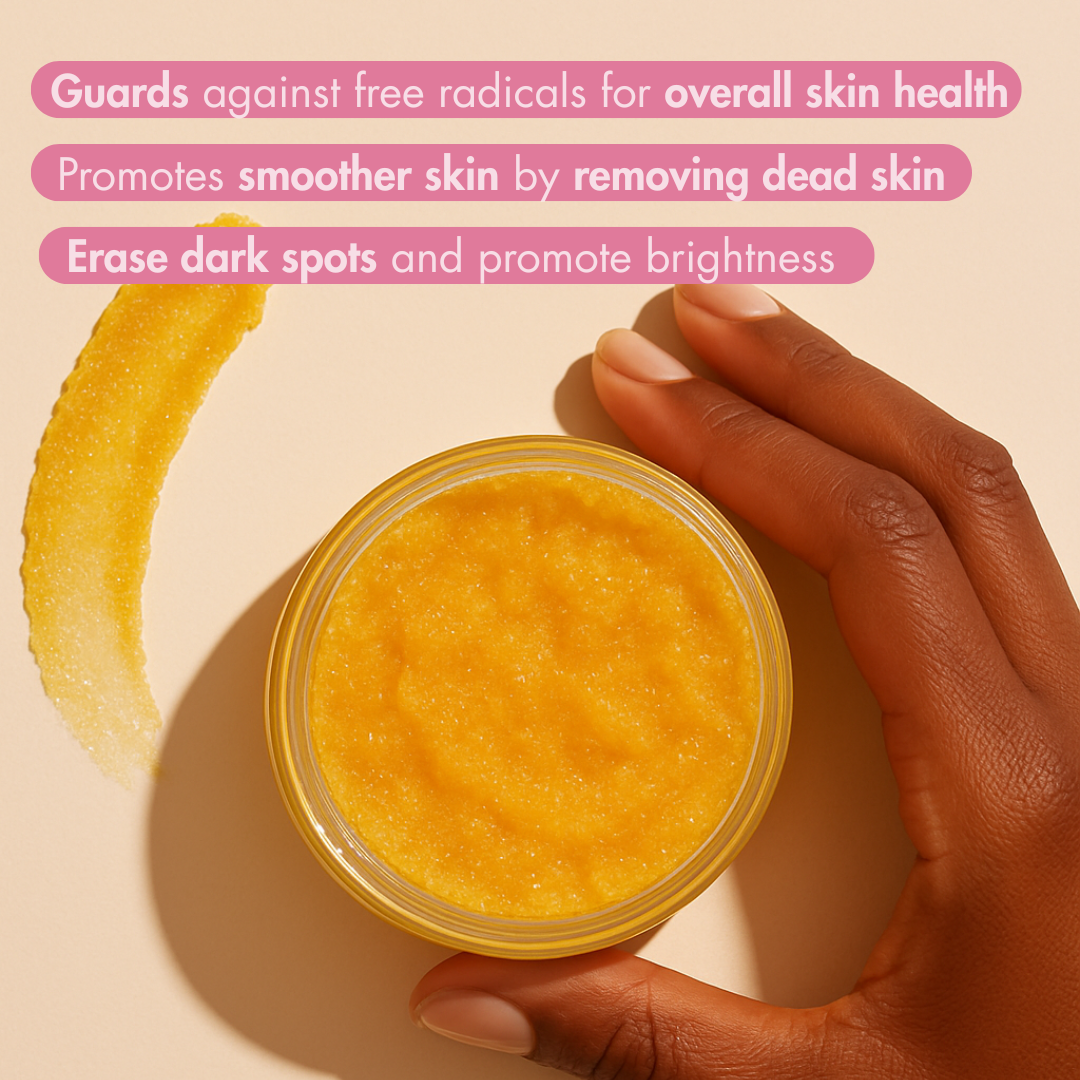 Our Brightening Turmeric & Kojic Acid Scrub gently exfoliates, leaving your skin smooth and hydrated. It removes rough patches, dark spots, and razor bumps with ease. Made with natural ingredients, it’s safe and gentle for daily use.